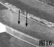 圖16滲碳層(硬化的表面)壓碎,表現(xiàn)在該錐形齒輪接觸表面上是縱長的裂紋.主要的裂紋從滲碳層心部結構的深處開始,慢慢向表面延伸。