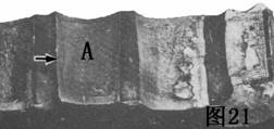 圖21是在齒輪的若干齒上,由于重復的重載荷引起的斷折的情況。標有“A”字的齒看來是由于疲勞裂紋首先折斷的(注意光滑、似夭鵝絨般的地帶)。