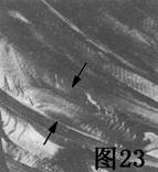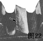 圖22是另一疲勞斷折的情況。箭頭指明裂紋在斷折處左邊緣開始,那里有一個小坑,靠近齒受壓側嚙合區(qū)的底部。緊靠裂源(箭頭指處)旁的地區(qū)受到充分的磨擦,說明裂紋起初發(fā)展緩慢。