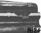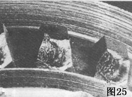 圖24中行星齒輪的大部分齒頂已碎掉。作業(yè)載荷產(chǎn)生的應力在這個點引起裂紋。最后,可能是由于疲勞,這些裂紋繼續(xù)發(fā)展,直到齒的表面。如果這是在短的使用之后發(fā)生的,可能表面硬化深度過大,需要作金相檢查來作出判斷。